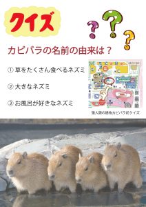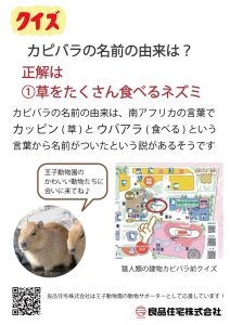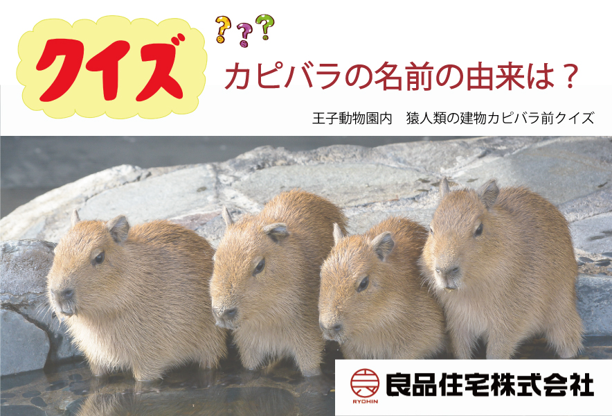 神戸王子動物園 カピバラ前クイズと答え 2025.09.01ブログ 良品住宅株式会社は王子動物園の動物サポーターとして 王子公園を応援しています! 猿人類の建物にあるカピバラの檻の前に 「カピバラの名前の由来は?」というクイズを提供しています。 王子公園へお越しの際はぜひご覧ください! ブログ